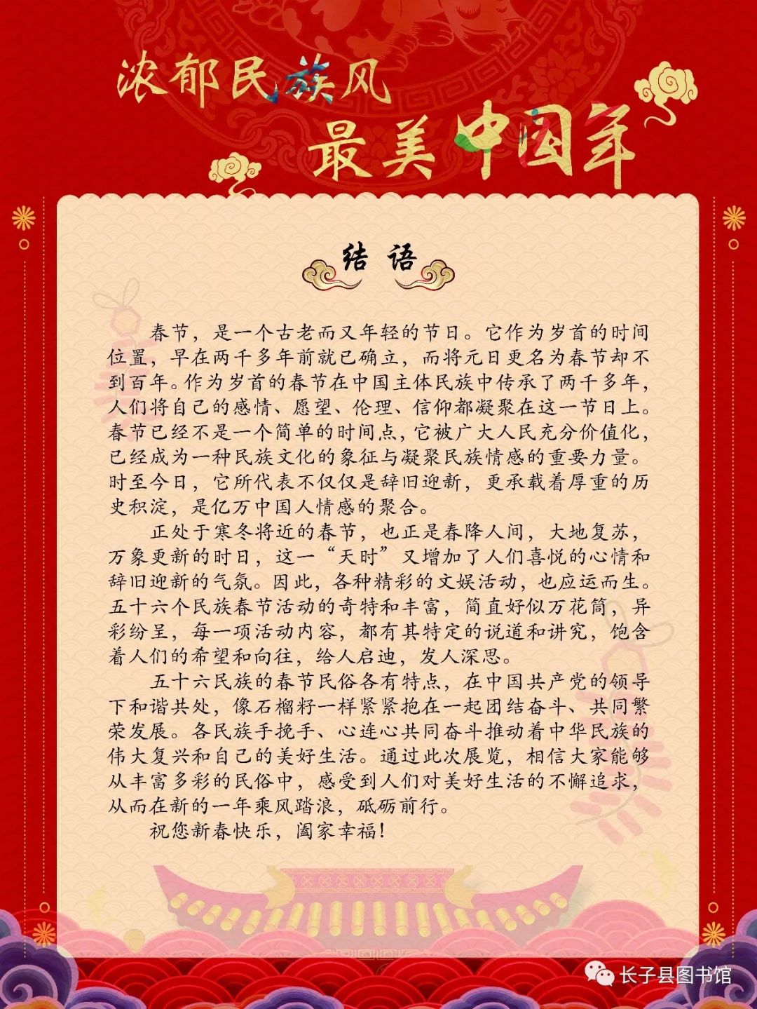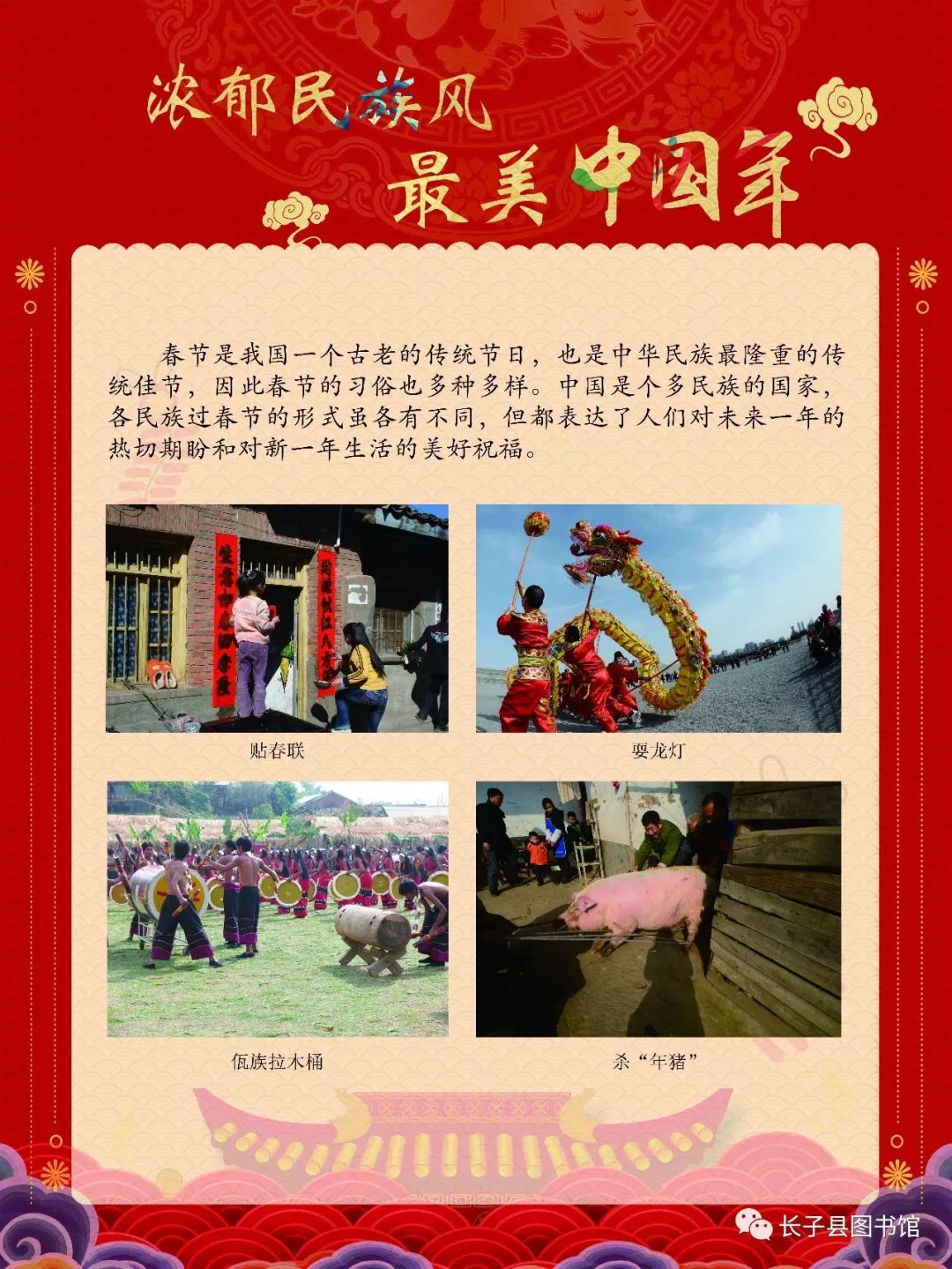 作为中华民族的第一大节日,传统意义上的春节已经成为以年终岁首为时间基础,围绕着除夕与新年,形成了丰富多彩的年节习俗。春节期间的许多传统活动、风俗典故,既集中地反映了我国人民的物质生活面貌和思想感情,又是中华民族物质文明和精神文明的系统反映。同时,随着社会的不断发展,春节也成为中华文化的重要名片,向世界人民传播着中国文化的精髓。