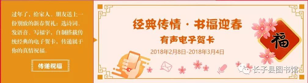 推广工程将经典古诗词和书法元素融入去年活动的电子有声贺卡平台,以国家图书馆“文津经典诵读”资源库中春节主题的古诗词作为贺卡背景,新增手写临摹历代名家“福”字功能,公众选择春联或录制语音祝福,生成别致的电子贺卡,通过微信发送给亲朋好友;推广工程还会在生成的电子贺卡内附上资源二维码,推介推广工程优秀传统文化资源,让全国公众在中华优秀传统经典的陪伴下欢度春节。