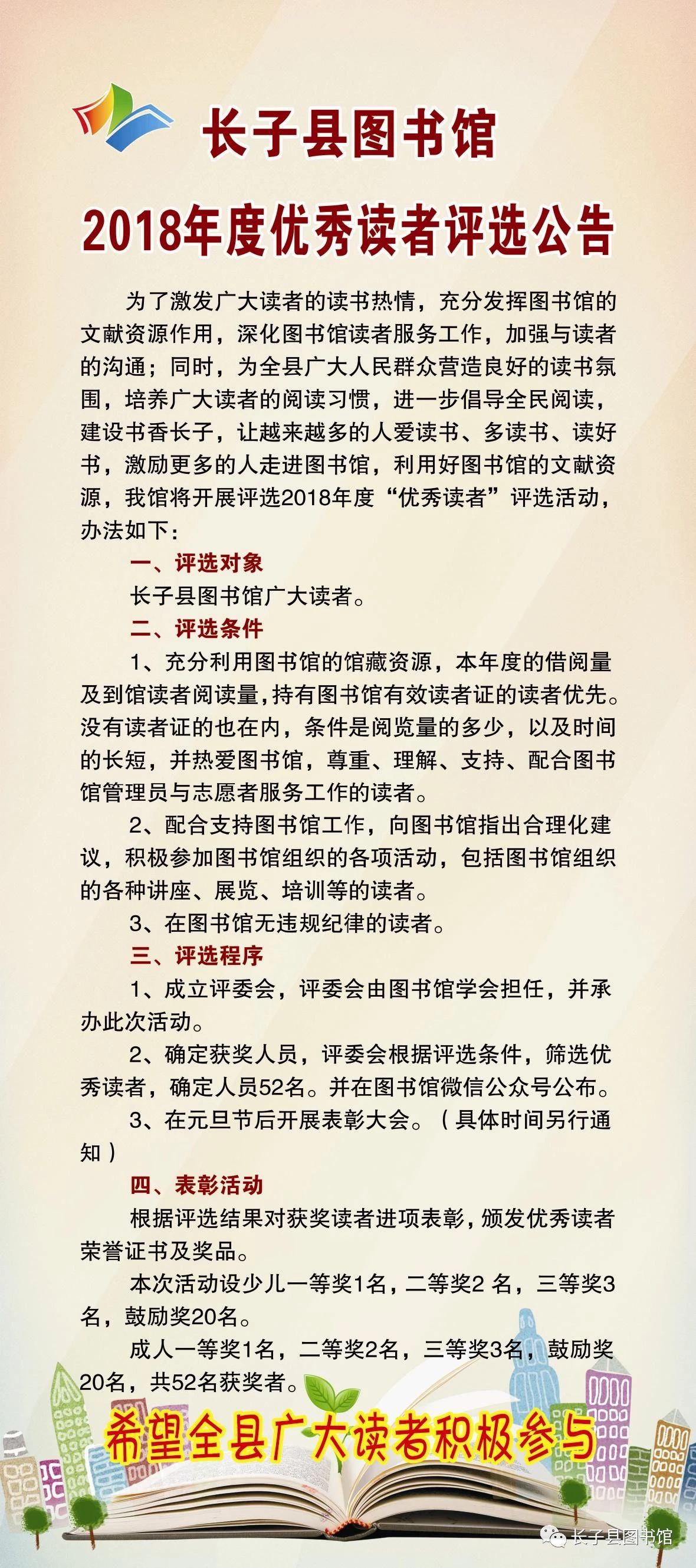 为了激发广大读者的读书热情,充分发挥图书馆的文献资源作用,深化图书馆读者服务工作,加强与读者的沟通;同时,为全县广大人民群众营造良好的读书氛围,培养广大读者的阅读习惯,进一步倡导全民阅读,建设书香长子,让越来越多的人爱读书、多读书、读好书,激励更多的人走进图书馆,利用好图书馆的文献资源,我馆将开展2018年度“优秀读者”评选活动,评选办法如下: