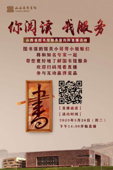在第32个“图书馆服务宣传周”来临之际。5月26日下午2点半,山西省图书馆举办“你阅读,我服务”图书馆服务宣传周直播活动,全网推广公共图书馆服务,促进全民阅读。